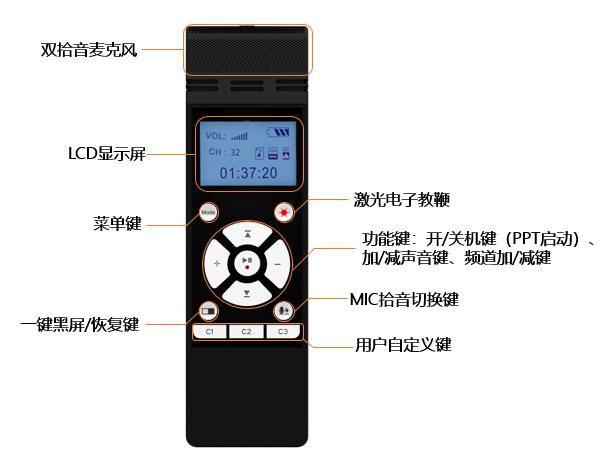 Sunm WM-WM-S無線話筒,使用GFSK數(shù)字調(diào)制/解調(diào)技術(shù),開機(jī)自動(dòng)進(jìn)入配對(duì)狀態(tài),配對(duì)成功后有提示音,自動(dòng)轉(zhuǎn)入接收狀態(tài);可以通過LCD屏了解音量、信號(hào)、電池余量、通信頻段、時(shí)間等信息,話筒自帶激光教鞭功能,話筒內(nèi)置高靈敏雙拾音麥克風(fēng),可90-160度拾音,可以與智慧管理主機(jī)或無線話筒接收器配對(duì)使用;無信號(hào)或無操作60秒內(nèi)話筒自動(dòng)進(jìn)入待機(jī)節(jié)能狀態(tài),電池低損耗,充滿電可連續(xù)工作≥8小時(shí)以上,是教育用戶“一師一麥”需求的不二選擇。