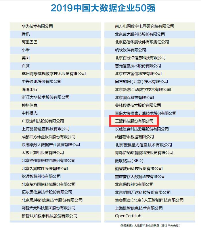 在此基礎上,《2019中國大數(shù)據(jù)產(chǎn)業(yè)發(fā)展白皮書》對基礎支撐層、數(shù)據(jù)服務層、融合應用層等進行了精準的層次化分析,在大數(shù)據(jù)產(chǎn)業(yè)機構分析之外,針對大數(shù)據(jù)產(chǎn)業(yè)發(fā)展的爆發(fā)性增長趨勢,總結并歸納出十大爆發(fā)點,為關注大數(shù)據(jù)產(chǎn)業(yè)的同行提供了全景式的展望,并梳理出各個領域的龍頭企業(yè),推薦入圍“2019中國大數(shù)據(jù)企業(yè)50強” ,“三盟科技”位列其中。