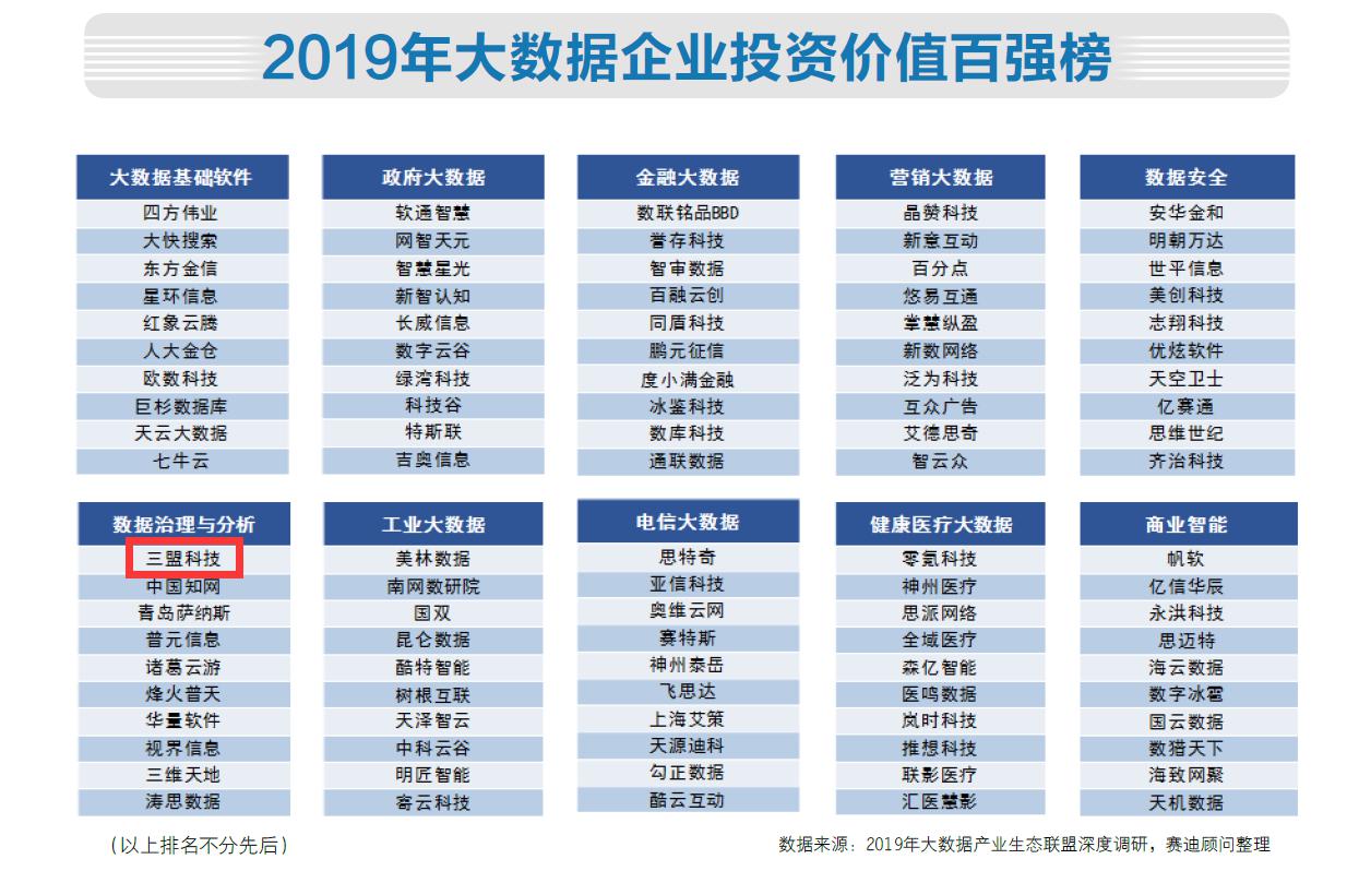 與此同時,白皮書從投融資角度出發(fā),并揭曉中國大數(shù)據(jù)投資價值百強榜單,從企業(yè)估值/市值、營收狀況、創(chuàng)新投入、專利數(shù)量、產(chǎn)品競爭力、企業(yè)潛力、領導層能力等多個維度進行定量與定性結合的評比,經(jīng)過專家打分,評選出中國最具投資價值的前100家企業(yè),“三盟科技”位列其中。