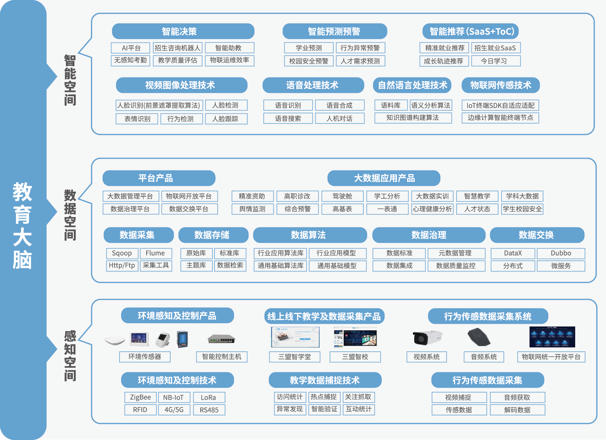 三盟科技“教育大腦”戰(zhàn)略,旨在助力教育用戶打造自己的智慧教育大腦、智慧教育人工智能指揮中心?!敖逃竽X”分別從感知空間、數(shù)據(jù)空間、智能空間為教育用戶提供全方位的、自主研發(fā)的新一代信息技術、產(chǎn)品與服務。