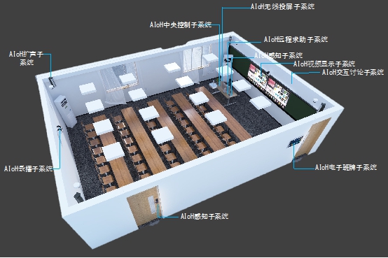 AIoH視頻顯示子系統(tǒng)、AIoH中央控制子系統(tǒng)、AIoH交互討論子系統(tǒng)、AIoH遠程求助子系統(tǒng)、AIoH感知子系統(tǒng)、AIoH電子班牌子系統(tǒng)、AIoH錄播子系統(tǒng)、AIoH無線投屏子系統(tǒng)、AIoH擴聲子系統(tǒng)等9大智能硬件AIoH子系統(tǒng)全方位建設智慧教室。