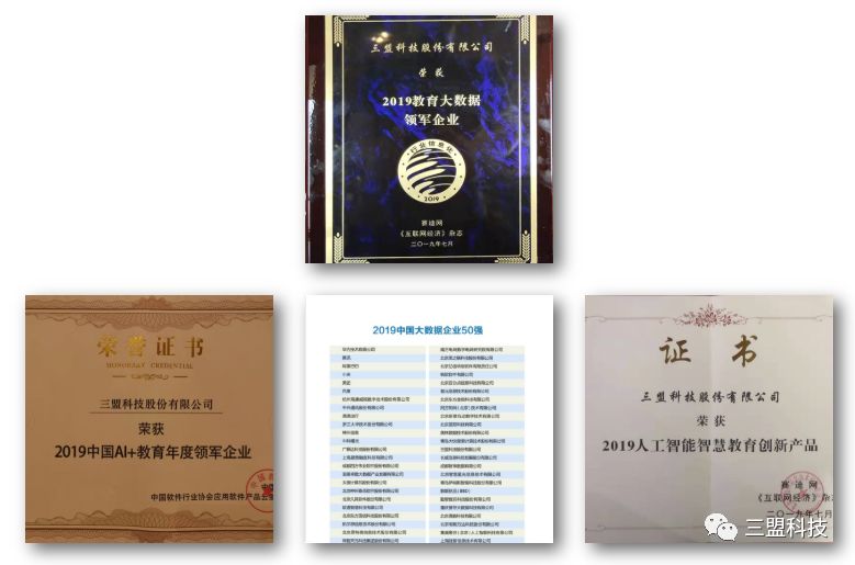 三盟科技作為“教育行業(yè)新一代信息技術高科技領軍企業(yè)”、“廣東省大數(shù)據(jù)骨干企業(yè)”,多年來一直專注人工智能、大數(shù)據(jù)、物聯(lián)網(wǎng)等新一代信息技術的自主研發(fā)與應用創(chuàng)新,高速發(fā)展的同時在各領域也碩果累累,2016-2019連續(xù)四年榮獲“中國大數(shù)據(jù)企業(yè)50強”、“教育大數(shù)據(jù)領軍企業(yè)”,2019年獲評“中國AI+教育年度領軍企業(yè)”、“人工智能智慧教育創(chuàng)新產(chǎn)品”等,種種榮譽都見證著三盟科技的成長。