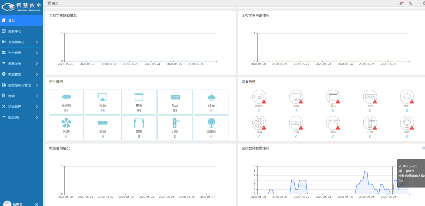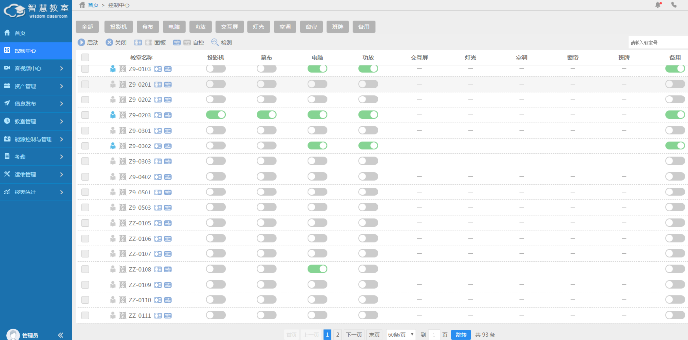 管理員無需一間間巡查,只要打開手機或電腦,就能管控教室里的每個設備。平臺還能對設備自動巡檢、報警、根據(jù)課表開關設備、遠程協(xié)助、對設備運行數(shù)據(jù)進行統(tǒng)計和分析。