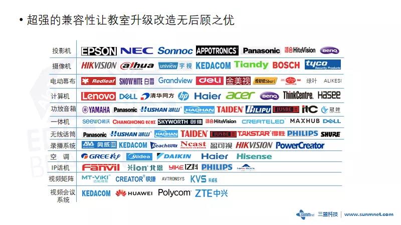 智校則不同,采用三盟科技自主研發(fā)的可編程中控系統(tǒng),所管理的多媒體教學(xué)設(shè)備可兼容市場上98%以上的品牌,因此校方不用擔(dān)心設(shè)備兼容性的問題。