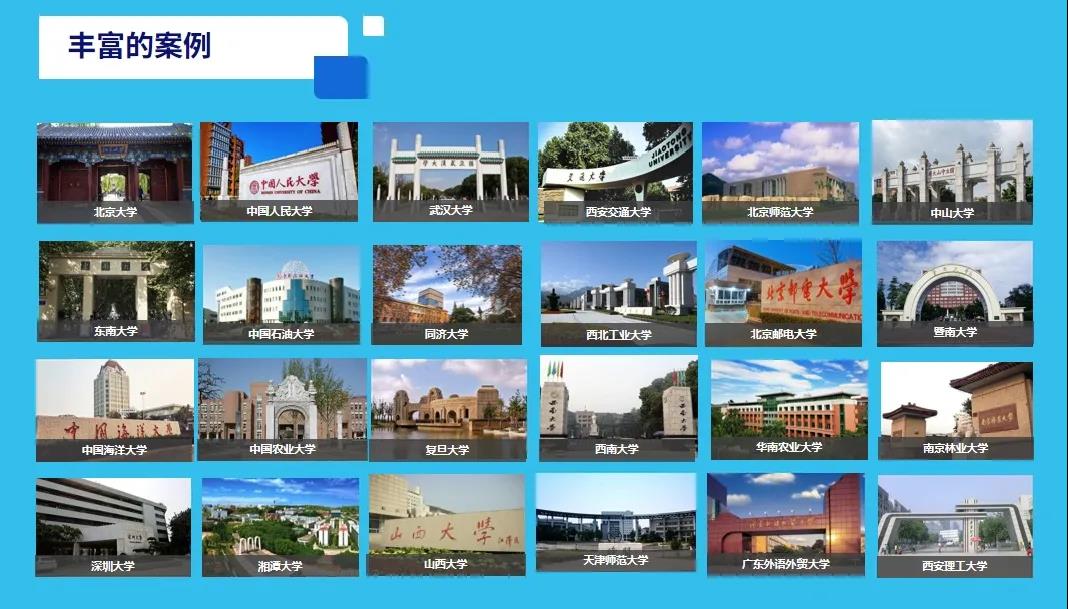 目前,大數(shù)據(jù)系列解決方案已在全國(guó)高?!奥涞亻_(kāi)花”,成功在北京大學(xué)、北京師范大學(xué)、同濟(jì)大學(xué)、北京郵電大學(xué)、西安交通大學(xué)、武漢大學(xué)、中山大學(xué)等近500余所全國(guó)名校應(yīng)用,其中包含50所雙一流院校/一流學(xué)科院校,100余所本科高校案例。