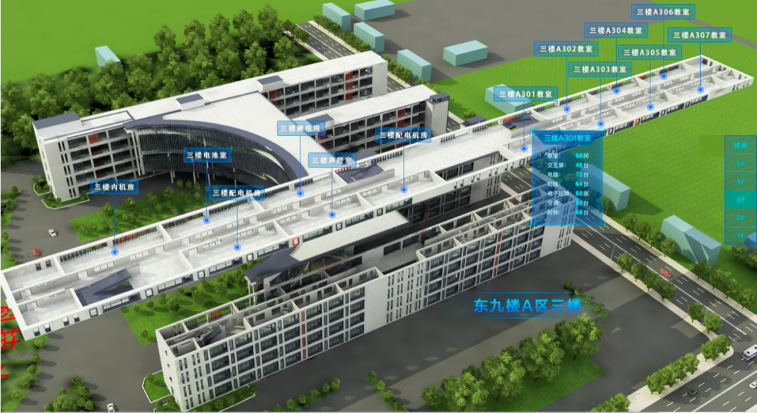 如何讓大體量的教室管理工作變簡單,三盟科技一直在積極探索。在智校平臺率先采用數(shù)字孿生技術(shù),對學(xué)校園區(qū)、教室進(jìn)行3D建模,借助平臺就能清晰看見各區(qū)域設(shè)備的運(yùn)作情況,如同親臨現(xiàn)場管理,讓管理質(zhì)量及效率有了跨越性提升。