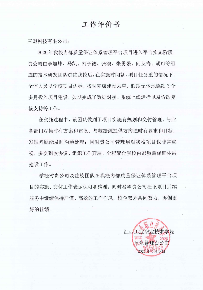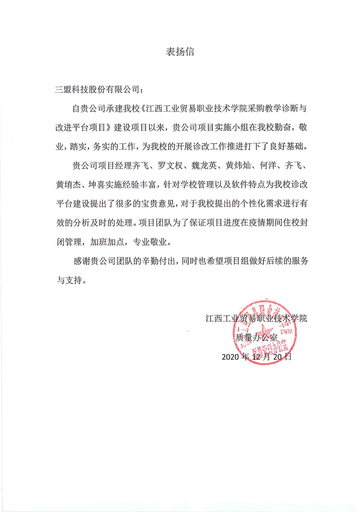 默默耕耘,終有所成。2021年,我們不斷創(chuàng)新技術(shù)、迭代服務(wù),為高職院校的教學(xué)診改工作提供強(qiáng)勁的技術(shù)支撐。短短數(shù)月,我們接連收到了來自江西工業(yè)貿(mào)易職業(yè)技術(shù)學(xué)院、江西工業(yè)職業(yè)技術(shù)學(xué)院、江西制造職業(yè)技術(shù)學(xué)院發(fā)來的表揚(yáng)信。