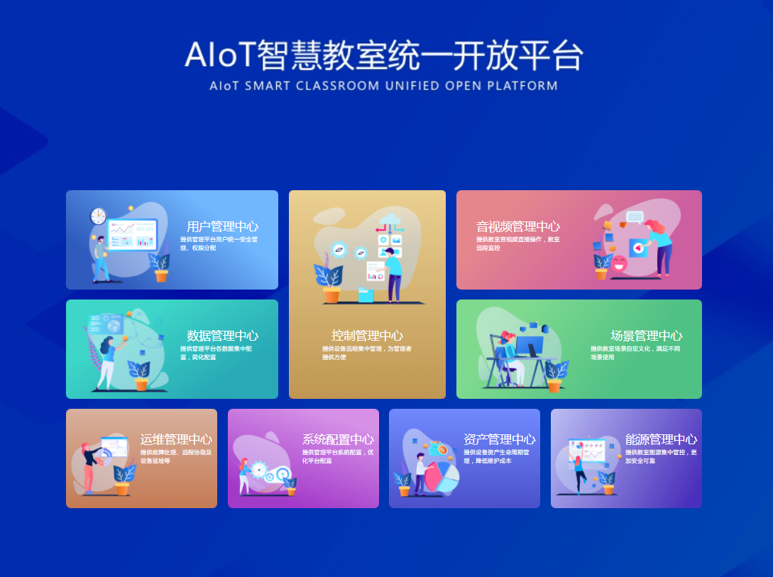 為了避免因管理平臺(tái)分散,導(dǎo)致人力運(yùn)維成本加重和管理效率低效的現(xiàn)象發(fā)生。智校4.0融合了九大管理中心,全面實(shí)現(xiàn)用戶、設(shè)備、系統(tǒng)、音視頻、班牌、能源、資產(chǎn)等子系統(tǒng)的統(tǒng)一管理,做到對(duì)智慧教室設(shè)備與數(shù)據(jù)的全局管控。由于平臺(tái)具備的兼容能力較為強(qiáng)大,可以支撐多達(dá)5000間智慧教室設(shè)備的統(tǒng)一管控。