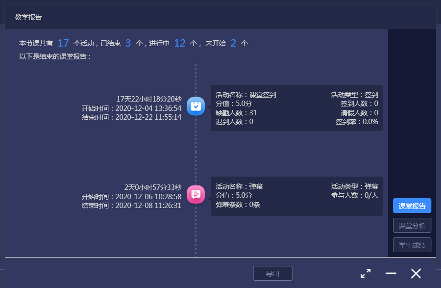 平臺(tái)還做到課后自動(dòng)生成教學(xué)報(bào)告并反饋至學(xué)校的教學(xué)督導(dǎo)辦公室,有利于對(duì)教學(xué)環(huán)節(jié)進(jìn)行質(zhì)量檢測(cè)、監(jiān)控,全方位保障教學(xué)質(zhì)量。