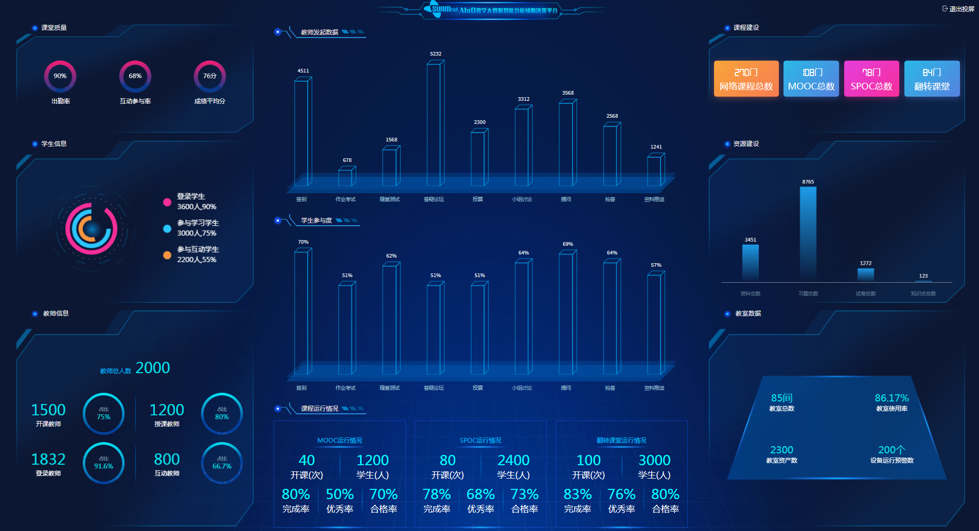 教學(xué)大數(shù)據(jù)3.0通過建立涵蓋教學(xué)資源數(shù)據(jù)、教學(xué)過程數(shù)據(jù)、教學(xué)行為數(shù)據(jù)的教學(xué)數(shù)據(jù)主題庫(kù),為高校積累教學(xué)全流程數(shù)據(jù)。同時(shí)對(duì)教學(xué)數(shù)據(jù)進(jìn)行多維度分析,做到對(duì)教學(xué)相關(guān)的風(fēng)險(xiǎn)項(xiàng)進(jìn)行自動(dòng)預(yù)警,并為不同角色提供智慧服務(wù)。
