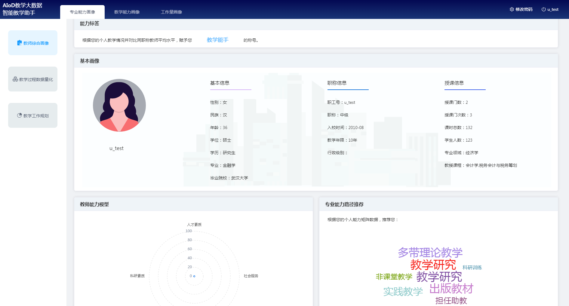 平臺通過綜合分析教師教學(xué)過程、教學(xué)內(nèi)容、教學(xué)行為、教學(xué)成果、教學(xué)評價等數(shù)據(jù),構(gòu)建教師綜合畫像,并根據(jù)教師的個人能力矩陣,推薦專業(yè)能力發(fā)展路徑,促進(jìn)教師自我能力提升。