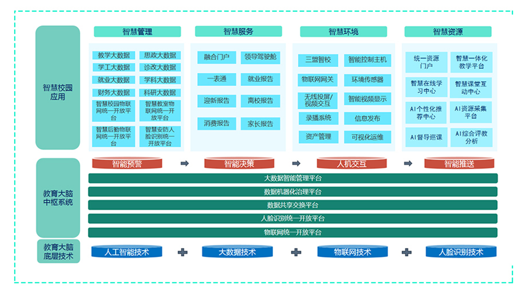 高教“教育大腦”旨在助力高等院校打造智慧校園整體解決方案,構建以“AI+大數(shù)據”為核心,打造集“智慧教學環(huán)境、智慧教學資源、智慧校園管理、智慧校園服務”于一體的智慧校園。