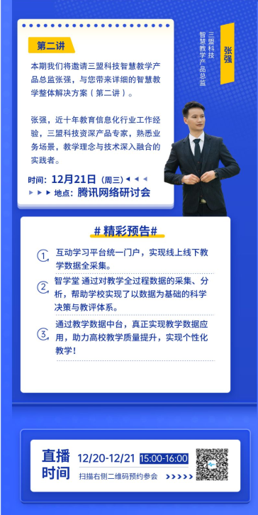 三盟科技傾情打造《三盟大講堂》,助力各類院校與各類合作伙伴在教育數(shù)字化轉(zhuǎn)型的目標(biāo)、方法、實施等方面達(dá)成共識,并給予實戰(zhàn)技巧。首期節(jié)目將圍繞“智慧教學(xué)產(chǎn)品”面向合作伙伴進(jìn)行專場分享,為期兩天,并特邀三盟科技產(chǎn)品解決方案總監(jiān)姜宏、智慧教學(xué)產(chǎn)品總監(jiān)張強(qiáng)線上開講,歡迎各類合作伙伴朋友們走進(jìn)研討會共同學(xué)習(xí),為教育數(shù)字化戰(zhàn)略轉(zhuǎn)型助力。