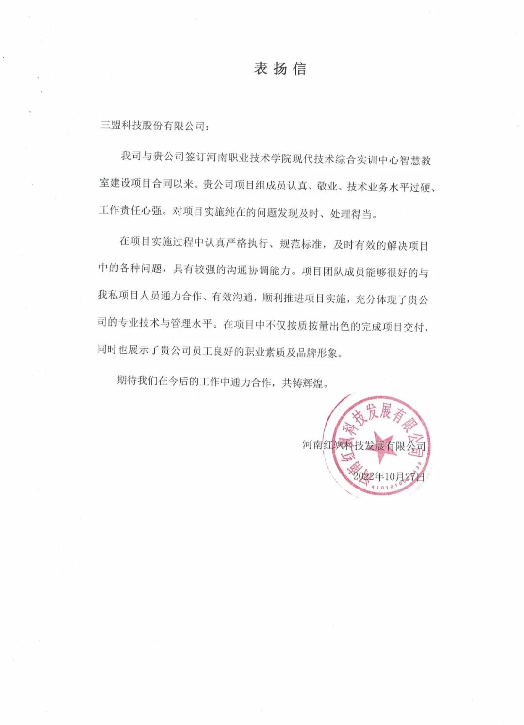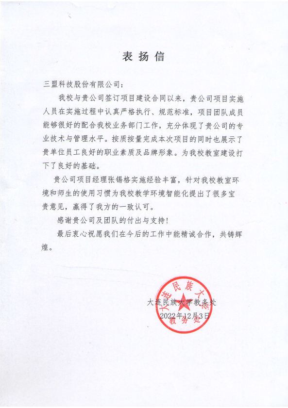 2022年8月,三盟科技與河南紅颯科技發(fā)展有限公司就河南職業(yè)技術(shù)學(xué)院現(xiàn)代技術(shù)綜合實(shí)訓(xùn)中心智慧教室建設(shè)項(xiàng)目簽訂合作合同,期間三盟科技項(xiàng)目實(shí)施團(tuán)隊(duì),憑借認(rèn)真、敬業(yè)、技術(shù)水平過(guò)硬、工作責(zé)任心強(qiáng),對(duì)項(xiàng)目實(shí)施過(guò)程中存在的問(wèn)題發(fā)現(xiàn)及時(shí)、處理得當(dāng),獲得校方和合作伙伴同事的高度認(rèn)可。