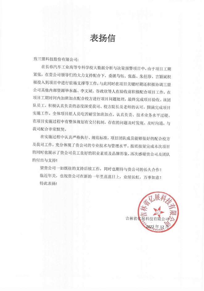收到這些表?yè)P(yáng)信,三盟科技倍感榮幸,衷心感謝各類(lèi)院校和合作伙伴的支持與信任!同時(shí),我們也為團(tuán)隊(duì)里每一個(gè)默默付出的三盟人而自豪,更為他們力爭(zhēng)做好客戶(hù)服務(wù)的決心與堅(jiān)持所打動(dòng)。