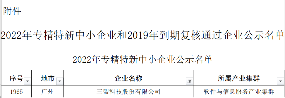 近日,廣東省工業(yè)和信息化廳公布了2022年專(zhuān)精特新中小企業(yè)名單公示,三盟科技股份有限公司(簡(jiǎn)稱(chēng):三盟科技)被認(rèn)定為廣東省專(zhuān)精特新中小企業(yè)。