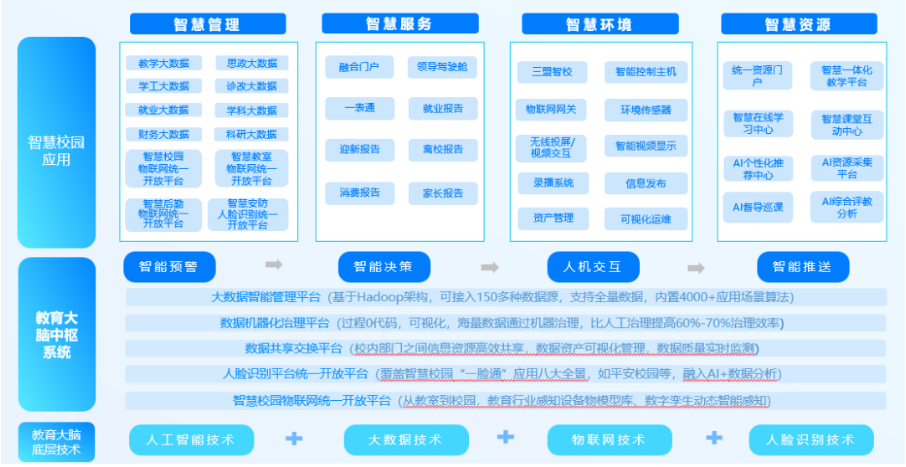 高教“教育大腦”是三盟科技面向高等院校推出的智慧校園整體解決方案。該方案深度融合人工智能技術(shù)AI、大數(shù)據(jù)技術(shù)AIoD、 物聯(lián)網(wǎng)技術(shù)AIoT、人臉識別技術(shù)AIoF四大核心技術(shù),通過業(yè)務協(xié)同、流程優(yōu)化、結(jié)構(gòu)重塑、精準管理,助力高校構(gòu)建集智慧環(huán)境、智慧資源、智慧管理、智慧服務于一體的智慧校園,旨在全方位提升教育管理效率和教育決策科學化水平。