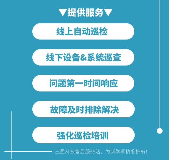 疫情全面放開(kāi)后的第一個(gè)新學(xué)期,相較于以往來(lái)的更早一些,為支撐各大高校開(kāi)學(xué)工作的開(kāi)展,全力保障學(xué)校管理信息化、教育教學(xué)信息化正常運(yùn)行,三盟科技成立售后服務(wù)專(zhuān)項(xiàng)組,啟動(dòng)“春季校園專(zhuān)項(xiàng)巡檢行動(dòng)”,針對(duì)我司交付的項(xiàng)目變“被動(dòng)故障”為“主動(dòng)排除”,在巡檢行動(dòng)中早發(fā)現(xiàn)、早報(bào)告、早處置,防患于未然,消除開(kāi)學(xué)季后顧之憂。