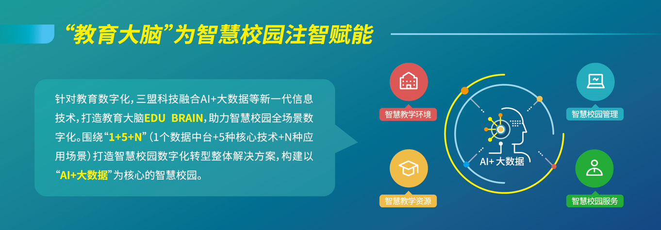 針對教育數(shù)字化,三盟科技融合AI+大數(shù)據(jù)等新一代信息技術(shù),打造教育大腦EDU BRAIN,助力智慧校園全場景數(shù)字化。圍繞“1+5+N”(1個數(shù)據(jù)中臺+5種核心技術(shù)+N種應(yīng)用場景)打造智慧校園數(shù)字化轉(zhuǎn)型整體解決方案,構(gòu)建以“AI+大數(shù)據(jù)”為核心的智慧校園。