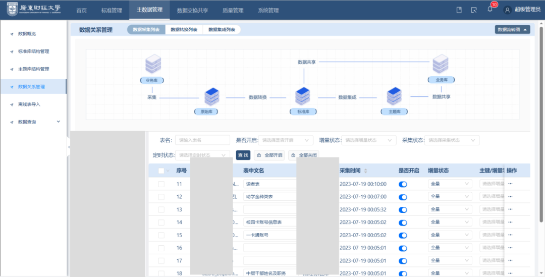 廣財(cái)數(shù)據(jù)治理的首要舉措,就是建設(shè)數(shù)據(jù)治理共享交換平臺(tái),實(shí)現(xiàn)對(duì)多源數(shù)據(jù)的采集。平臺(tái)采集了人事系統(tǒng)、科研系統(tǒng)、教務(wù)系統(tǒng)、學(xué)工系統(tǒng)、研究生管理系統(tǒng)、財(cái)務(wù)系統(tǒng)、后勤系統(tǒng)等13個(gè)業(yè)務(wù)系統(tǒng)的結(jié)構(gòu)化數(shù)據(jù)。