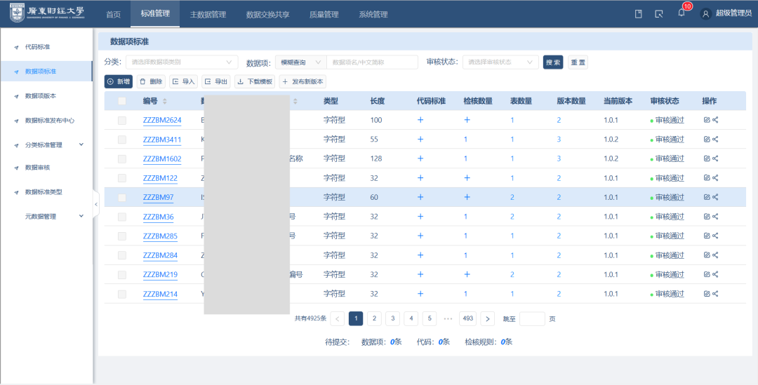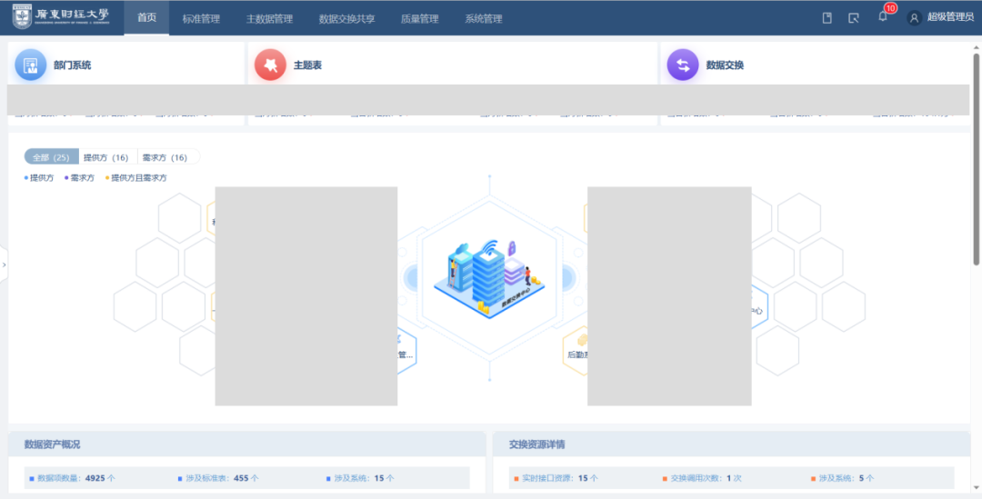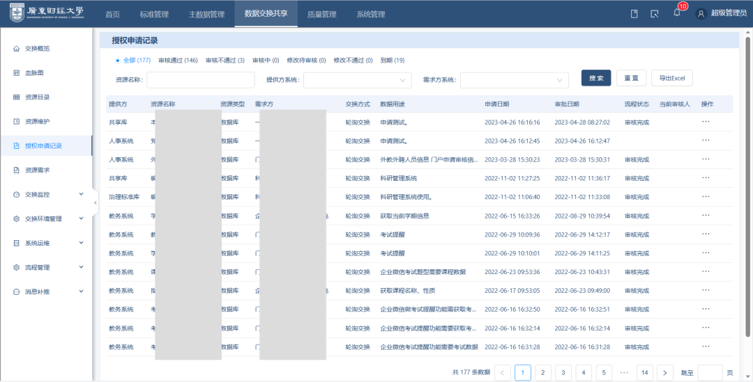 截至目前,廣財(cái)?shù)臄?shù)據(jù)治理已取得了顯著進(jìn)展和成效。自2019年12月開(kāi)展數(shù)據(jù)治理至今,學(xué)校已建成數(shù)據(jù)項(xiàng)標(biāo)準(zhǔn)4925個(gè),代碼標(biāo)準(zhǔn)263條。平臺(tái)已對(duì)接13個(gè)業(yè)務(wù)系統(tǒng),累計(jì)開(kāi)放數(shù)據(jù)資源396個(gè),完成資源授權(quán)數(shù)146個(gè),累計(jì)數(shù)據(jù)交換總數(shù)高達(dá)22.2億條。