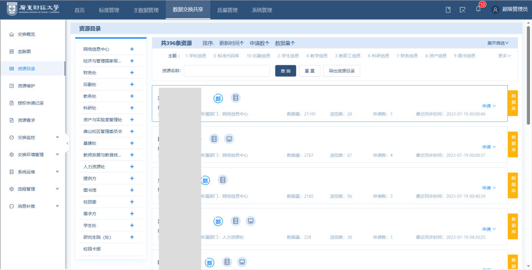 當(dāng)前,數(shù)據(jù)服務(wù)平臺(tái)已為廣財(cái)?shù)目蒲刑?、教?wù)處、人力資源處、校團(tuán)委、資產(chǎn)與實(shí)驗(yàn)室管理處等13個(gè)業(yè)務(wù)部門提供了數(shù)據(jù)共享交換服務(wù),實(shí)現(xiàn)數(shù)據(jù)資源的自助共享,減少業(yè)務(wù)部門線下跨部門的溝通協(xié)調(diào)成本,大幅度提高了數(shù)據(jù)共享的工作效率。