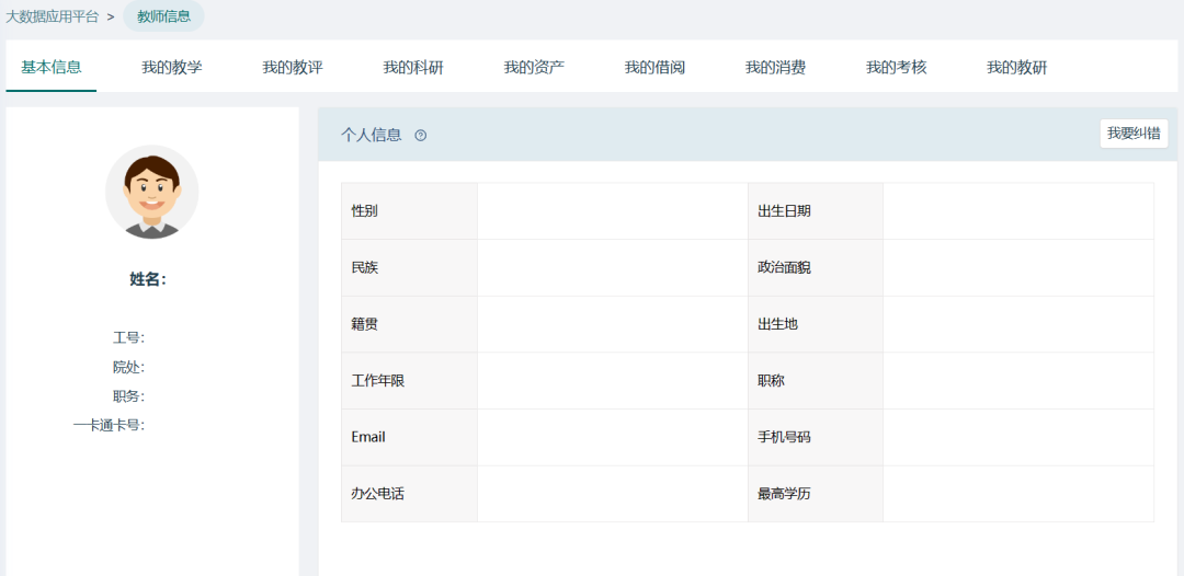 “教師一張表”主要針對(duì)全校教職工的在校生活及工作成果進(jìn)行數(shù)據(jù)呈現(xiàn),主要包含教職工的基本信息、教學(xué)、教研,科研、消費(fèi)等方面的數(shù)據(jù),綜合分析教職工的校園工作生活狀態(tài)。