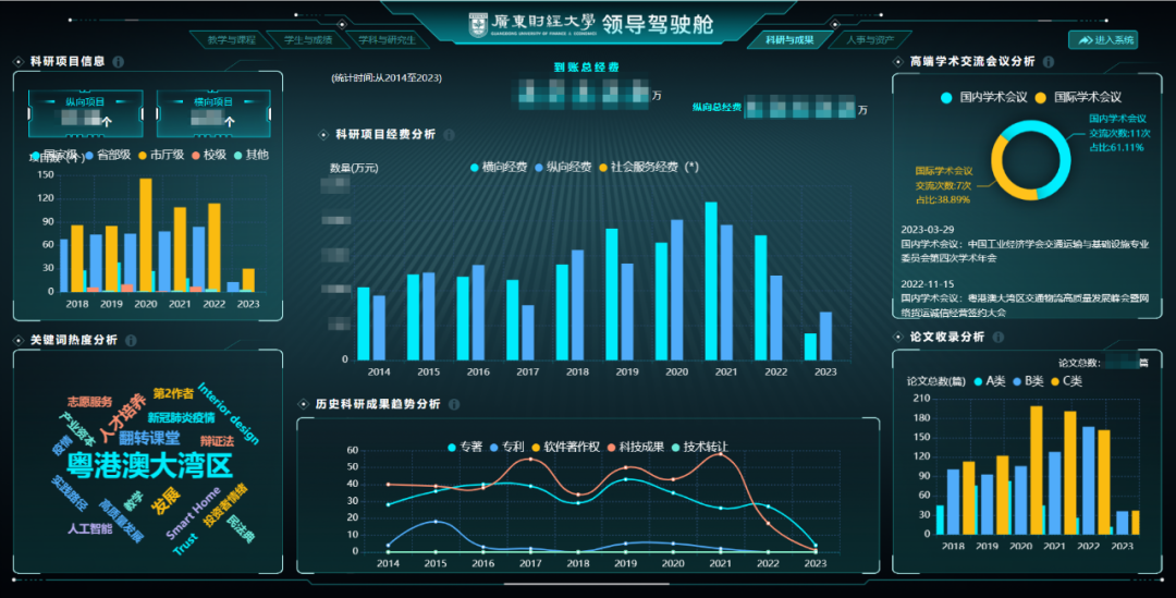 廣財(cái)?shù)念I(lǐng)導(dǎo)駕駛艙系統(tǒng)主要包括教學(xué)與課程、學(xué)生與成績(jī)、學(xué)科與研究生、科研與成果、人事與資產(chǎn)5大核心版塊,每個(gè)主題緊扣學(xué)校關(guān)注的核心管理維度進(jìn)行數(shù)據(jù)分析,為學(xué)校的教學(xué)管理和服務(wù)提供科學(xué)決策指南。