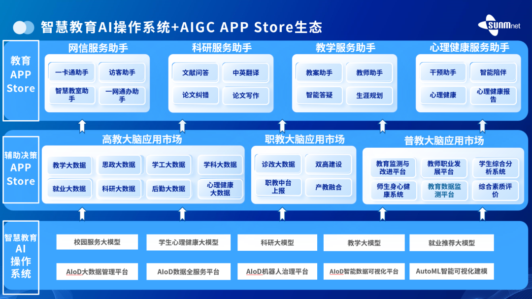三盟科技基于自主研發(fā)的教育垂類大模型——智慧教育AIGC大模型操作系統為底座,打造智慧教育AIGC App Store,構建教育全場景AIGC服務助手廣場。三盟科技AIGC服務助手廣場提供涵蓋辦公、科研、教學、學習、招生、生活、情感、就業(yè)等類型的智能助手,為高等教育、基礎教育提供全方位的AI服務,高效響應學校管理者、教師、學生、家長的多樣化需求。