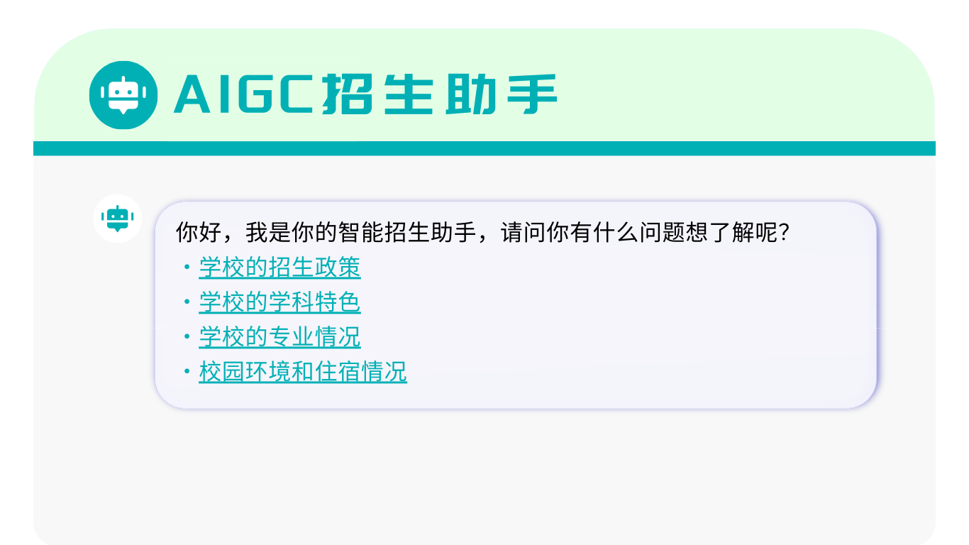 AIGC招生助手不僅能對學校的招生政策、師資及專業(yè)等各類咨詢應答如流,有效減輕招生老師的負擔。而且它還深度融合“AI+大數(shù)據(jù)”技術(shù),能為考生智能推薦適配的專業(yè),并對學校招生宣傳效果進行評估及提出優(yōu)化建議,助力學校升級信息咨詢服務,不斷優(yōu)化招生宣傳工作。