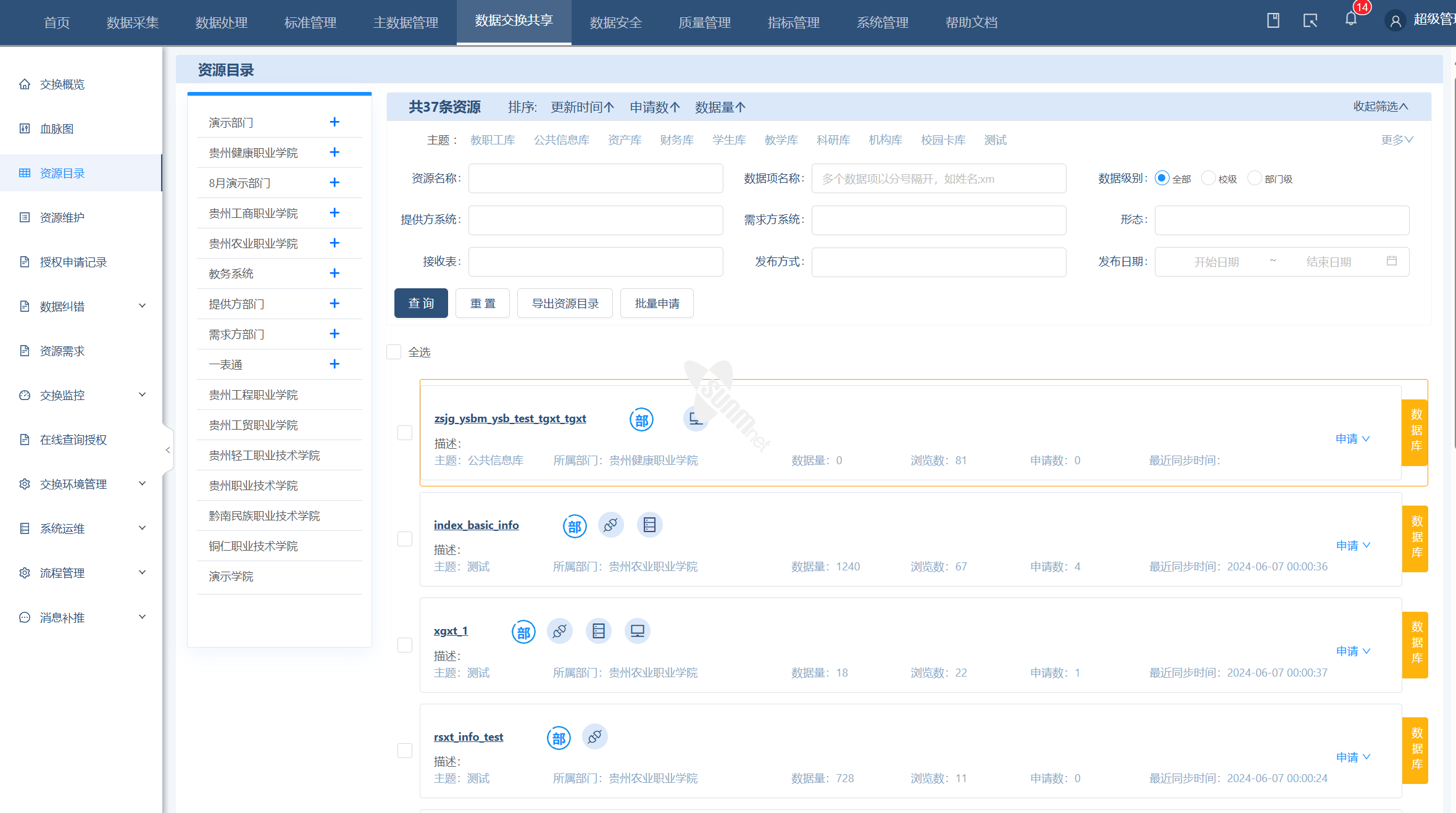 平臺(tái)通過幫助學(xué)校重構(gòu)數(shù)據(jù)共享機(jī)制,實(shí)現(xiàn)數(shù)據(jù)的有序流轉(zhuǎn)。采用建立數(shù)據(jù)資源目錄的創(chuàng)新模式,對學(xué)校真實(shí)可用的數(shù)據(jù)資源進(jìn)行清單展示,為學(xué)校各部門提供清晰的數(shù)據(jù)交換與共享的索引,實(shí)現(xiàn)跨部門數(shù)據(jù)資源的自助交換與共享,大大提升數(shù)據(jù)資源的利用率。