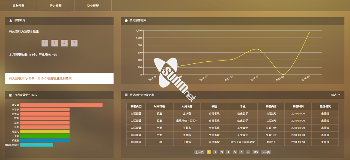 學(xué)生心理問題往往隱于冰山之下,深不可測(cè)。一旦出現(xiàn)異常行為更是難以防范,平臺(tái)提供了預(yù)警與防范之法,通過采集校內(nèi)學(xué)生多維度數(shù)據(jù)生成學(xué)生個(gè)人畫像和群體畫像,并結(jié)合學(xué)生近期行為表現(xiàn),及時(shí)發(fā)現(xiàn)并預(yù)警學(xué)生心理、行為的異常變化,提前告警學(xué)生掛科、消費(fèi)、夜歸、逃課、沉迷網(wǎng)絡(luò)等信息,有效預(yù)防學(xué)生安全事故的發(fā)生。