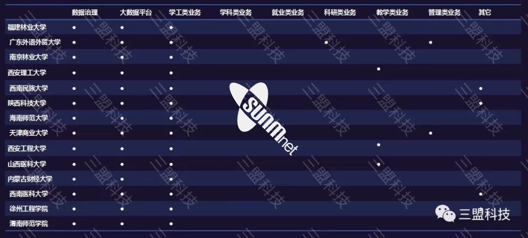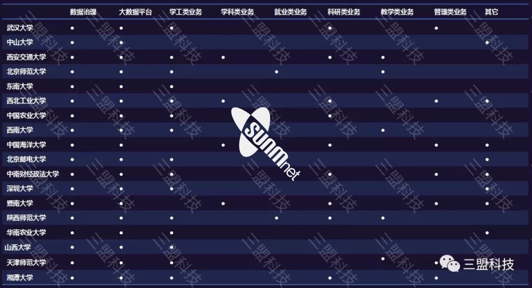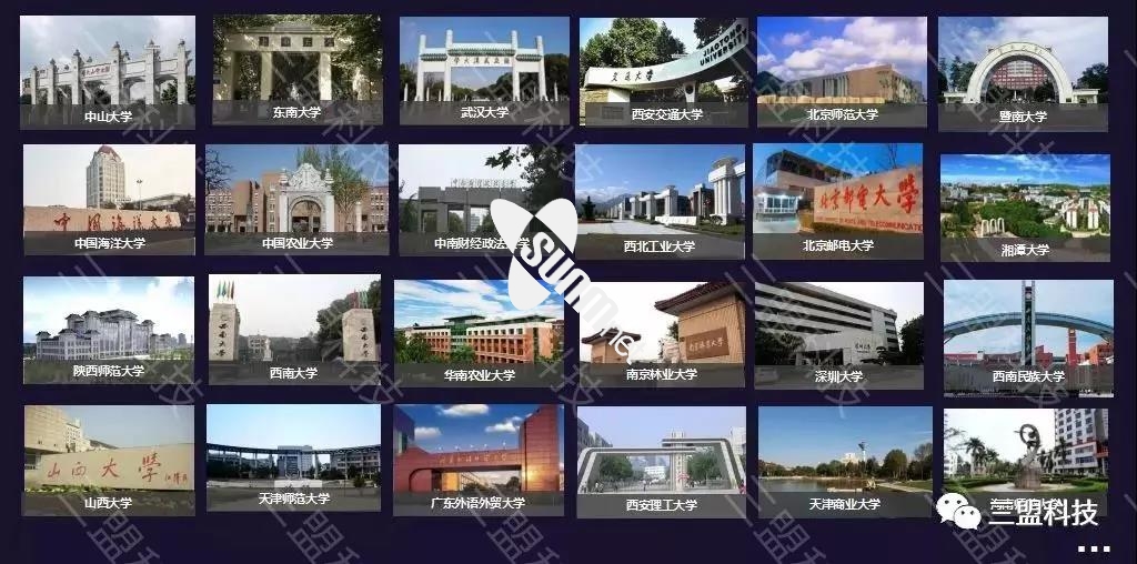 在教育大數(shù)據(jù)領(lǐng)域,三盟科技全國(guó)項(xiàng)目案例數(shù)量第一、模塊深度第一、銷售業(yè)績(jī)第一。大數(shù)據(jù)系列解決方案已經(jīng)成功在武漢大學(xué)、中山大學(xué)、西安交通大學(xué)、北京師范大學(xué)、東南大學(xué)、西北工業(yè)大學(xué)、中國(guó)農(nóng)業(yè)大學(xué)等近200所全國(guó)名校應(yīng)用,其中包含22所雙一流大學(xué)。