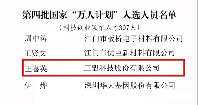 日前,中共中央組織部辦公廳下發(fā)《關(guān)于印發(fā)第四批國家“萬人計(jì)劃”入選人員名單的通知》(以下簡稱《通知》)?!锻ㄖ凤@示,三盟科技董事長王喜英女士入選科技創(chuàng)業(yè)領(lǐng)軍人才名單。