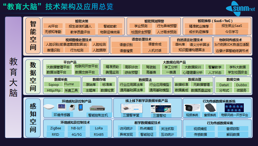 “工欲善其事必先利其器”,2018年三盟科技重磅推出的“教育大腦”戰(zhàn)略,將大數據、人工智能、物聯網等技術,應用于教育信息化2.0建設,其基于AI+大數據的智慧校園建設,包括智慧教學環(huán)境、智慧教學資源、智慧校園管理、智慧校園服務等全系列完整解決方案,實現在滿足智慧校園建設標準的基礎上進一步提高高校的教學、科研、管理水平,促進高校的快速發(fā)展。