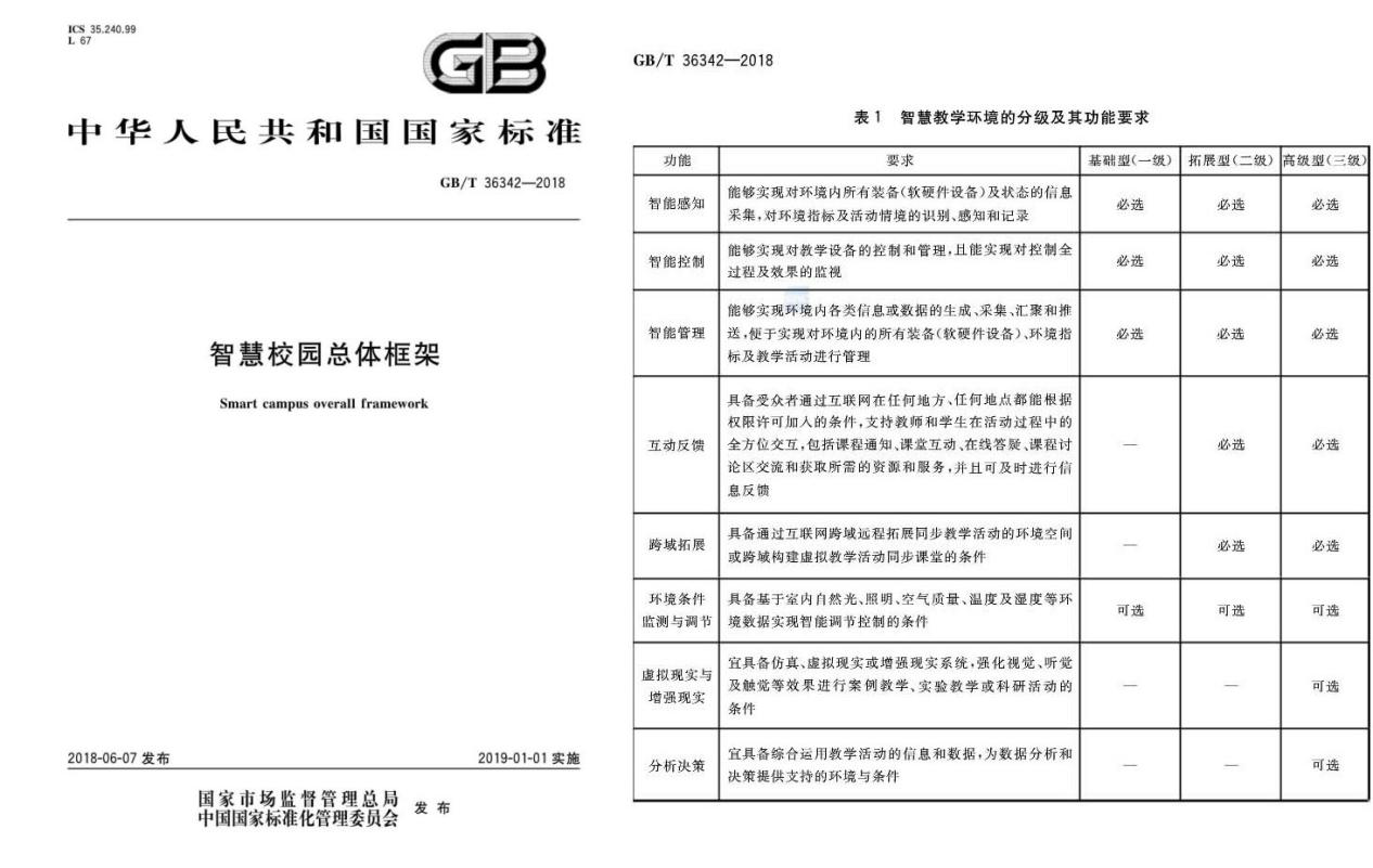 2019年1月1日,國(guó)家標(biāo)準(zhǔn)化管理委員會(huì)頒布的《智慧校園總體框架(GB/T 36342-2018)》,從智能感知、智能控制、智能管理、互動(dòng)反饋、跨域擴(kuò)展、環(huán)境條件監(jiān)測(cè)與調(diào)節(jié)、虛擬現(xiàn)實(shí)與增強(qiáng)現(xiàn)實(shí)和分析決策等8個(gè)方面對(duì)智慧教學(xué)環(huán)境進(jìn)行了定義,巧合的是,從2016年起,三盟科技就在企業(yè)內(nèi)部以8個(gè)方面提出智慧教室建設(shè)的要求,與國(guó)家標(biāo)準(zhǔn)委提出的要求吻合。