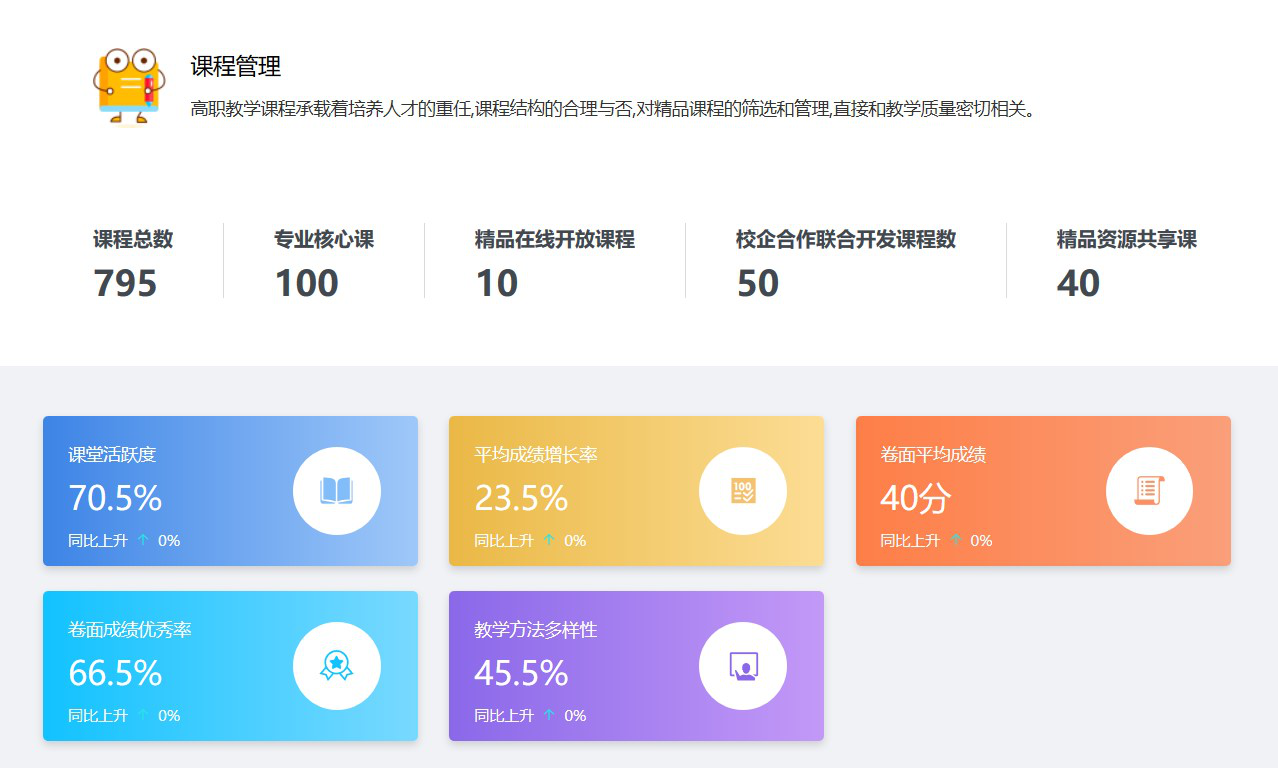 大數(shù)據(jù)分析與決策平臺(tái)所有數(shù)據(jù)均來(lái)源于大數(shù)據(jù)平臺(tái),數(shù)據(jù)可做到真實(shí)性和實(shí)時(shí)性。平臺(tái)可以對(duì)學(xué)校、專業(yè)、課程、師資、學(xué)生五個(gè)層面做整體畫像分析,對(duì)專業(yè)、課程、師資、學(xué)生可以具體到單個(gè)個(gè)體做數(shù)據(jù)分析。如課程層面:課程基本信息、課程資源、課堂教學(xué)、實(shí)訓(xùn)教學(xué)、教學(xué)評(píng)價(jià)等多個(gè)方面進(jìn)行質(zhì)控點(diǎn)的設(shè)置和分析,有指標(biāo)均來(lái)自學(xué)校指標(biāo)體系,數(shù)據(jù)分析目前能夠做到對(duì)比分析和趨勢(shì)分析。