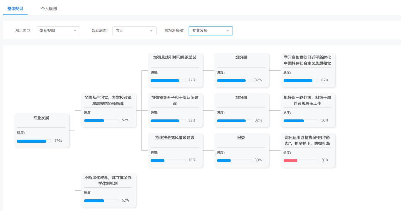 l 內(nèi)部質(zhì)量保證監(jiān)測(cè)平臺(tái)以最全面的指標(biāo)體系為學(xué)校提供量化體系支撐,支持通過(guò)體系視圖查看規(guī)劃目標(biāo)的層級(jí)關(guān)系,學(xué)校層面的規(guī)劃體系可以細(xì)分到專業(yè)、課程、教師層面;