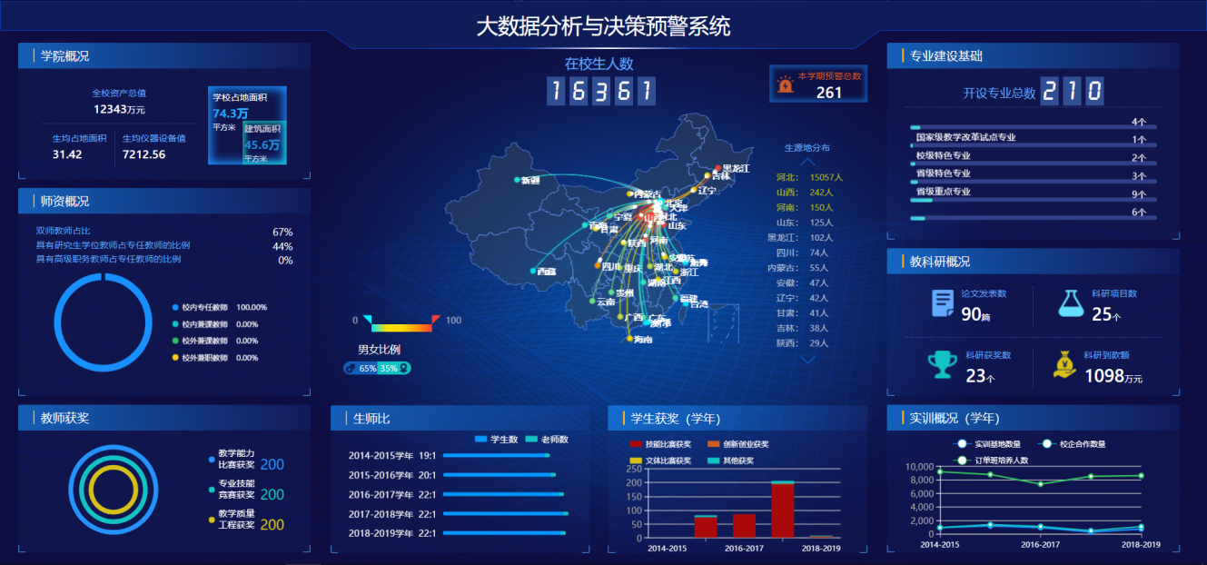 領(lǐng)導(dǎo)駕駛艙模塊將學(xué)校領(lǐng)導(dǎo)關(guān)心的核心指標(biāo)及校情內(nèi)容,通過(guò)大屏、PC端及移動(dòng)端進(jìn)行展示,通過(guò)基本校情、運(yùn)行成果、預(yù)警情況展示,用表盤設(shè)計(jì)(如柱狀,餅圖,線性圖等)動(dòng)態(tài)、實(shí)時(shí)的展示診改效果,常態(tài)化支撐學(xué)校的診改工作。