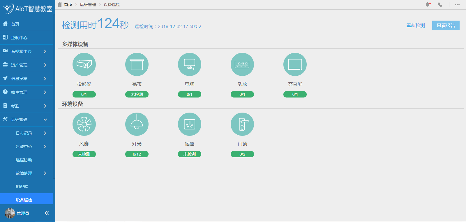從設(shè)備自檢—故障告警—故障處理—知識(shí)庫(kù)—數(shù)據(jù)報(bào)表,AIoT智慧教室物聯(lián)網(wǎng)統(tǒng)一開(kāi)放平臺(tái)進(jìn)行可視化運(yùn)維管理,隨時(shí)隨地掌控設(shè)備運(yùn)行狀況,