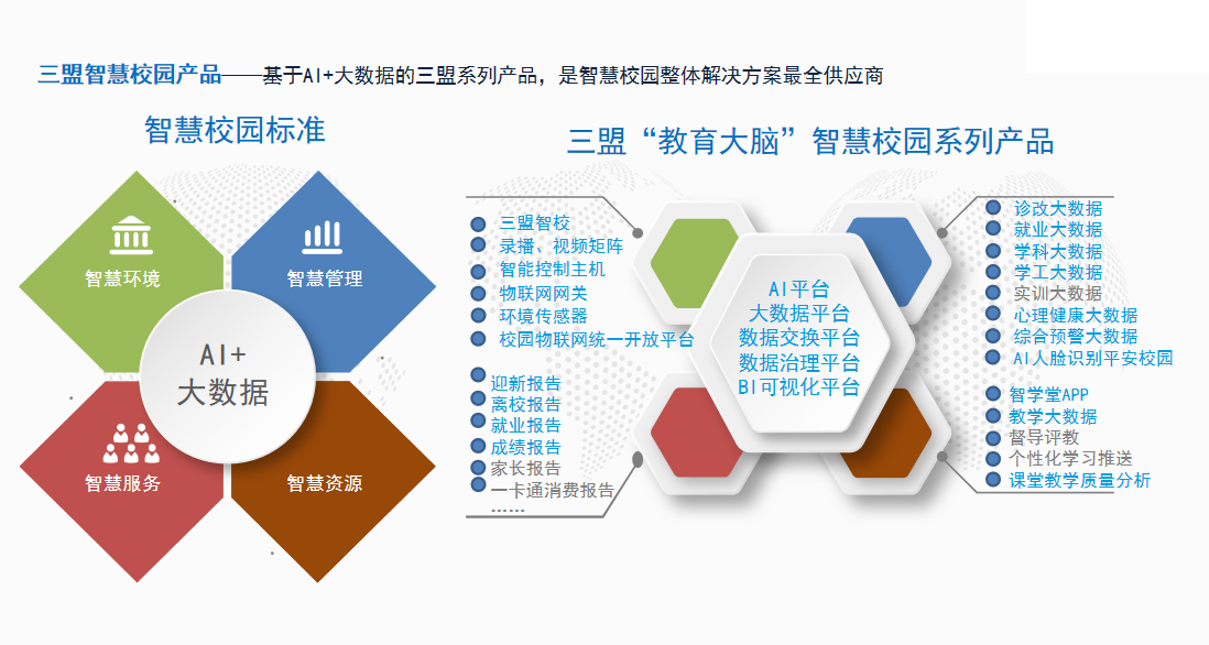 三盟科技基于“教育大腦”戰(zhàn)略,進(jìn)行智慧校園產(chǎn)品創(chuàng)新,完全符合智慧校園標(biāo)準(zhǔn)。
