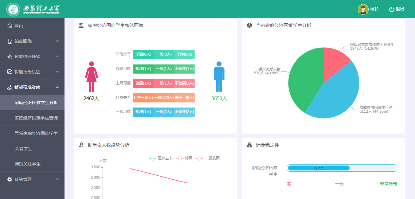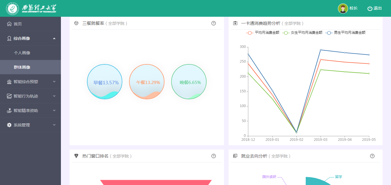 三盟科技學(xué)工大數(shù)據(jù)分析系統(tǒng)有綜合畫像、綜合預(yù)警、行為軌跡、精準(zhǔn)就業(yè)分析、系統(tǒng)管理、思政分析、心理健康分析、精準(zhǔn)資助認(rèn)定八個(gè)主要功能模塊。這些功能模塊包括但不限于學(xué)工、心理、團(tuán)委、宿管、離校、就業(yè)及其它功能,是學(xué)生管理工作的有效輔助工具,對(duì)建立良好學(xué)風(fēng)、維護(hù)穩(wěn)定校園秩序、提升管理服務(wù)水平都有著重要作用。