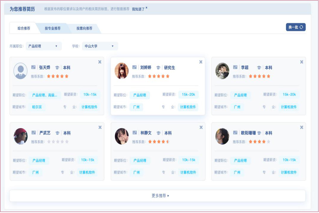 采用大數(shù)據(jù)+AI的技術(shù),實(shí)現(xiàn)人才與崗位的精準(zhǔn)雙向推薦功能