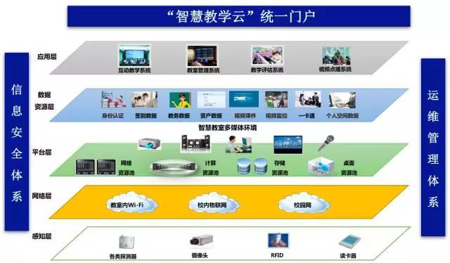 項目整體架構按照五層兩翼設計,其中五層包括:感知層、網(wǎng)絡層、平臺層、數(shù)據(jù)資源層和應用層;兩翼包括信息安全體系和運維管理體系。整個架構涵蓋了智慧課室建設的方方面面,并且能很好的將整個信息化環(huán)境融合在一起,創(chuàng)造一個舒適的學習環(huán)境,豐富課堂教學方式,全面促進教學創(chuàng)新的智慧型課室。